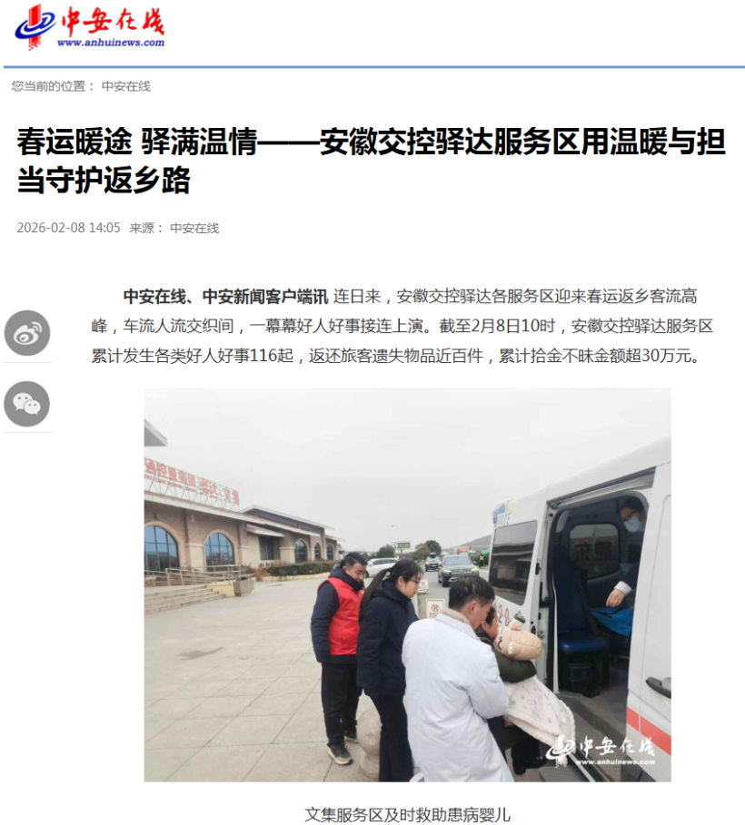 安徽日报、中安在线等媒体则通过图文形式报道了服务区主动为旅客纾难解困的暖心事件,为春运归乡路铺就温暖底色。