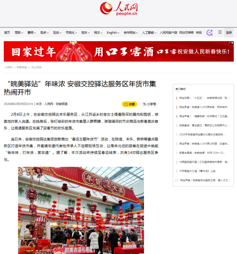 人民网、安徽讯视、安徽高速之声则将镜头对准驿达服务区创新推出的“春运主题年货节”活动。各媒体通过图文与视频,生动报道了服务区年货市集的热闹场景,色泽诱人的腊味年货、地道平价的徽州糕点,鱼灯、葫芦等手工艺品琳琅满目,还有非遗传承人带来面塑、剪纸等现场互动,让旅客不下高速就感受到浓厚的年俗氛围。《江淮晨报》头版头条报道了此次活动。